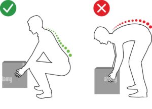 - Para levantar cualquier cosa del piso es preferible hacer una sentadilla con la espalda recta y sostenerlo con los brazos lo más pegados al cuerpo posible, el cuádriceps y algunos músculos de las extremidades superiores le quitarán algunos kilogramos a la columna lumbar.
